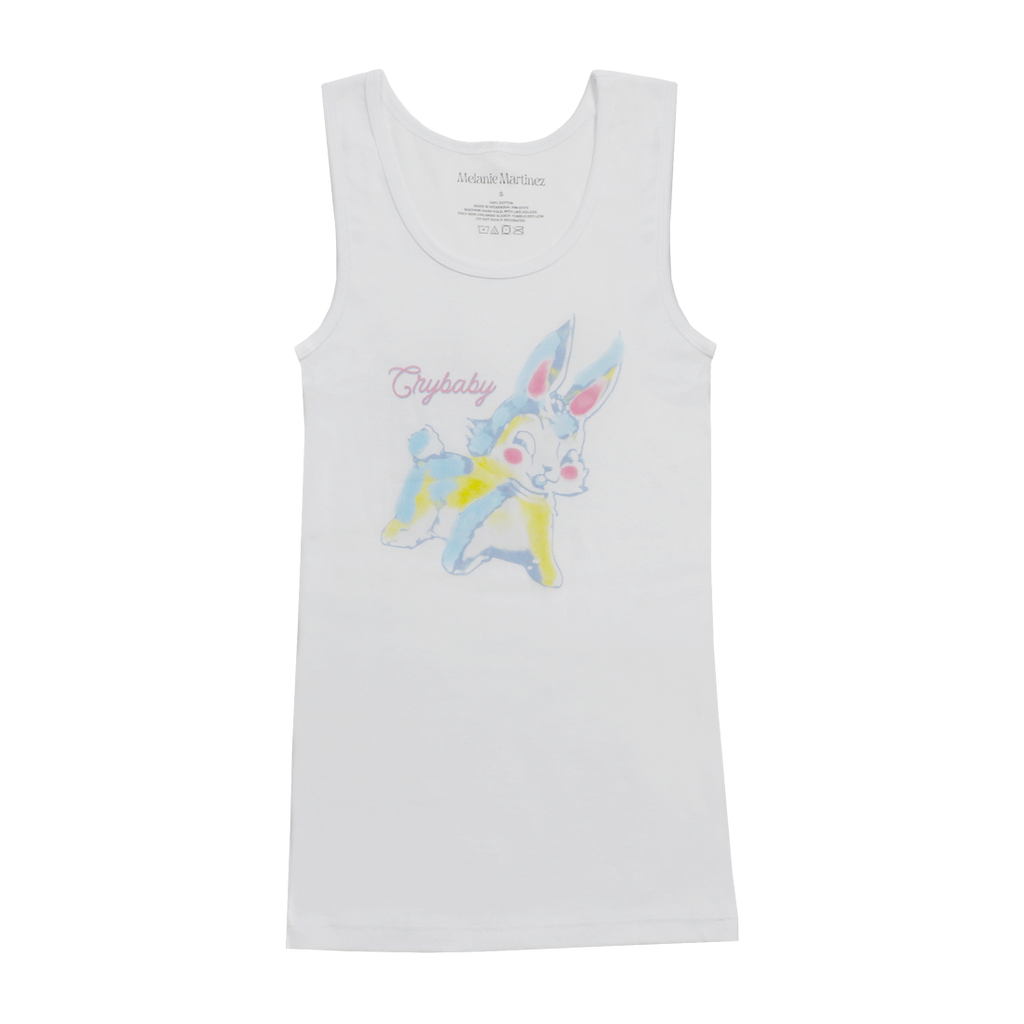 Cry Baby Tank featuring 'Cry Baby' and graphic on the front of a unisex white tank.
