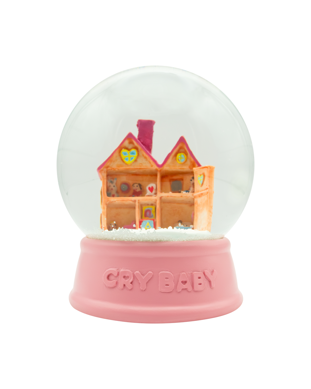 A nostalgic limited reissue of the original Cry Baby collectible snowglobe, featuring the iconic Dollhouse in a delicate pink base.