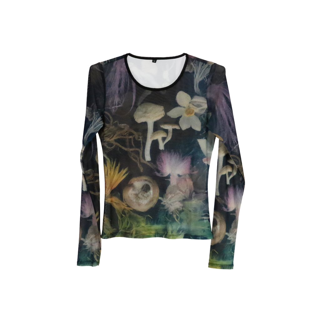 'Floral Mesh Top' all over print design on a mesh see-through top. The mesh top photographed is a size M.