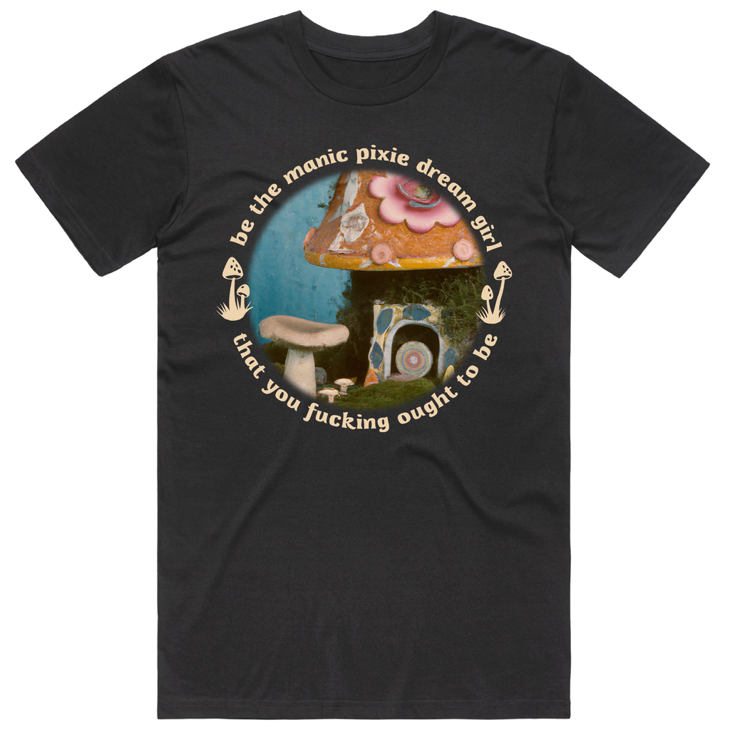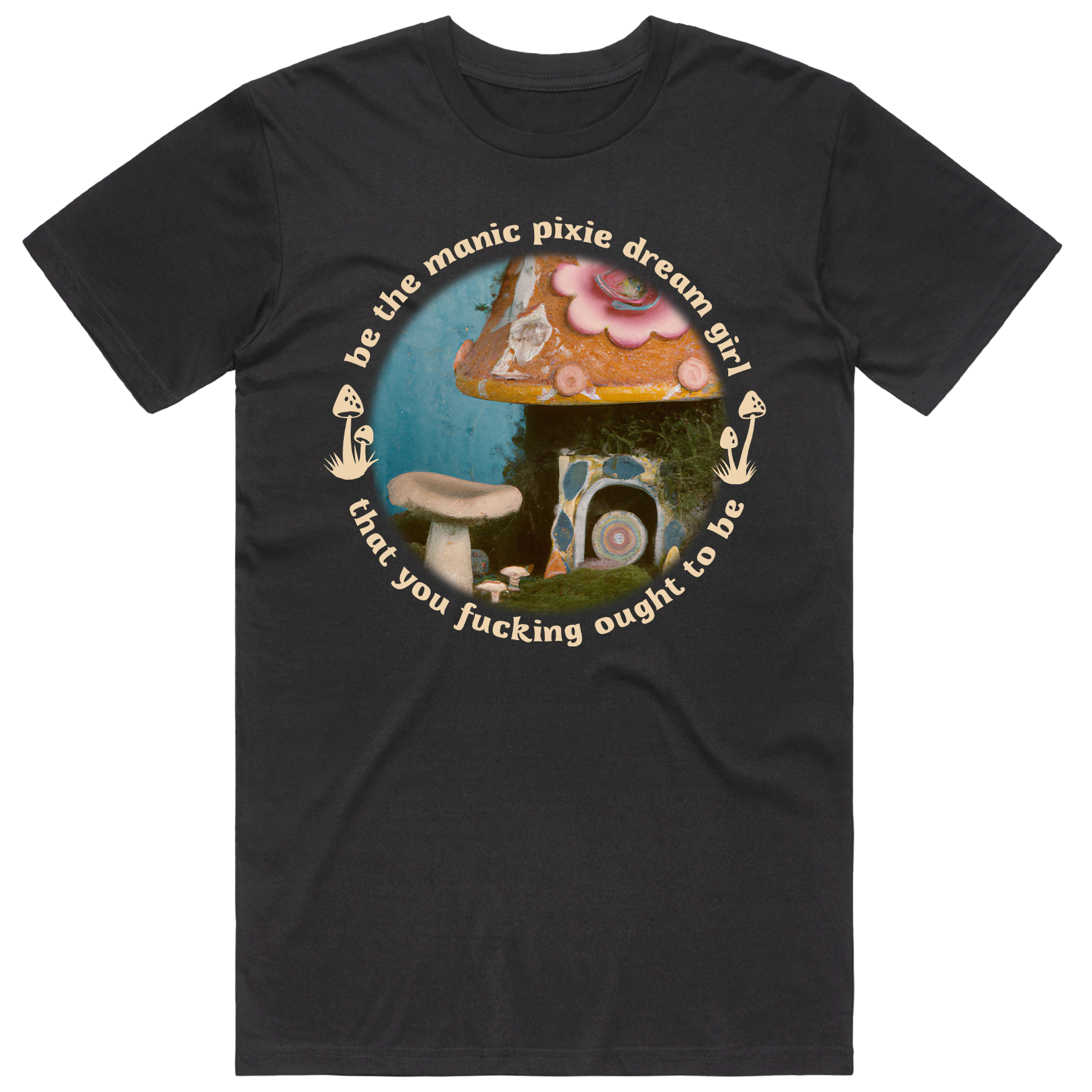The "Nymphology T-shirt" features a graphic of mushrooms in a circle, with lyrics from the song “Nymphology” on surrounding it. Printed on a black t-shirt.YOU MIGHT ALSO LIKE
